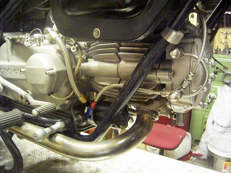 Der feine Kupplungsabrieb z.B. wird bei dieser technischen Lösung durch den ganzen Motor gepumpt. Dies wird auf die Dauer für solche Bauteile wie Ventilführung oder Kurbelwellenlager, eigentlich alle einer Reibung ausgesetzten Stellen, zu einem erhöhten Verschleiß führen. Der originale Ölfilter ist lediglich als einfaches Sieb ausgeführt und damit viel zu grob, als dass man von einem Filter sprechen könnte. Die feinen Schwebeteilchen kann diese Ausführung nicht zurückhalten. Deshalb die Überlegung zu einem Feinstromfilter mit einer modernen Ölfilterpatrone. Bei der Ausführung im Hauptstrom wird das gesamte Motoröl gereinigt bevor es die Schmierstellen erreicht.